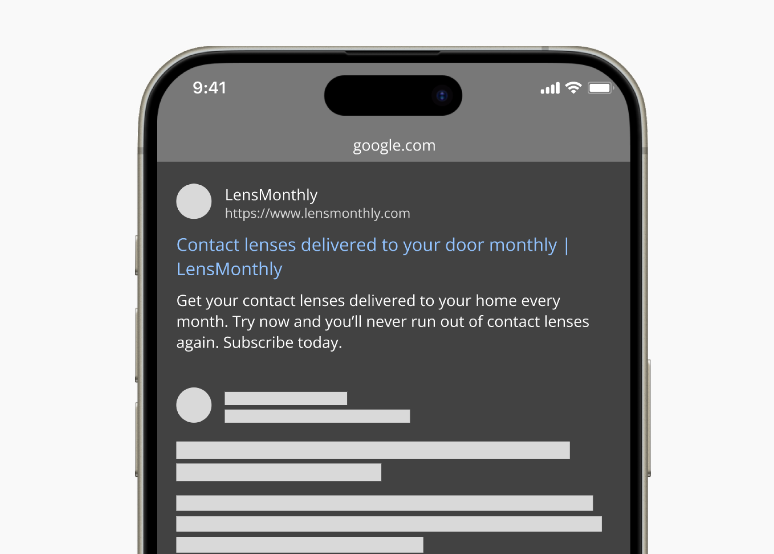 In this challenge scenario, an elderly user is doing a Google search to find an easy way to buy contact lenses online. The challenge was to write a convincing title and meta description for a website that sells subscription contact lenses delivered to a user every 30 days.